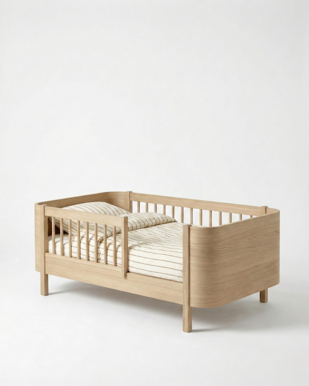 A thoughtfully designed wooden toddler bed made from solid teak wood, featuring smooth curves and safety rails for worry-free sleep. Customizable to grow with your child and blend seamlessly into modern interiors.